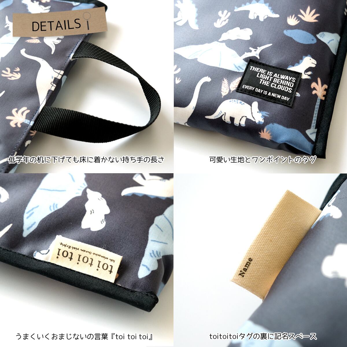 低学年の机の横に掛けても床に着かないよう持ち手の長さも調整しています。