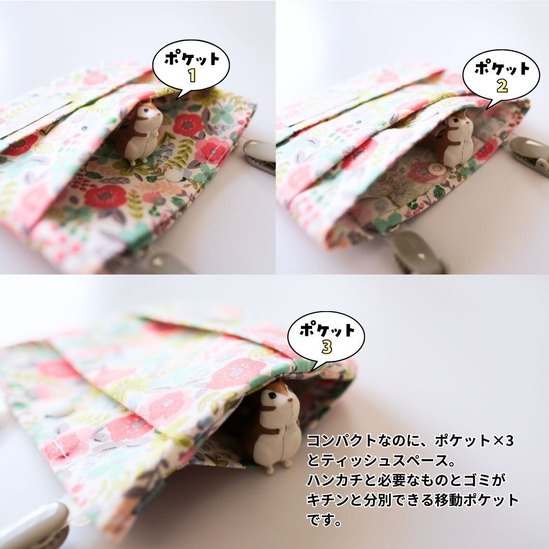 ゴミ箱のない場所で使用したティッシュや除菌シート。どこにも捨てられなくてハンカチやキッズ携帯と一緒に移動ポケットにポイッ。そんな事がなくなるよう、ゴミ用のポケットを作りました!汚したくないものとゴミを別にできるので衛生面でも◎